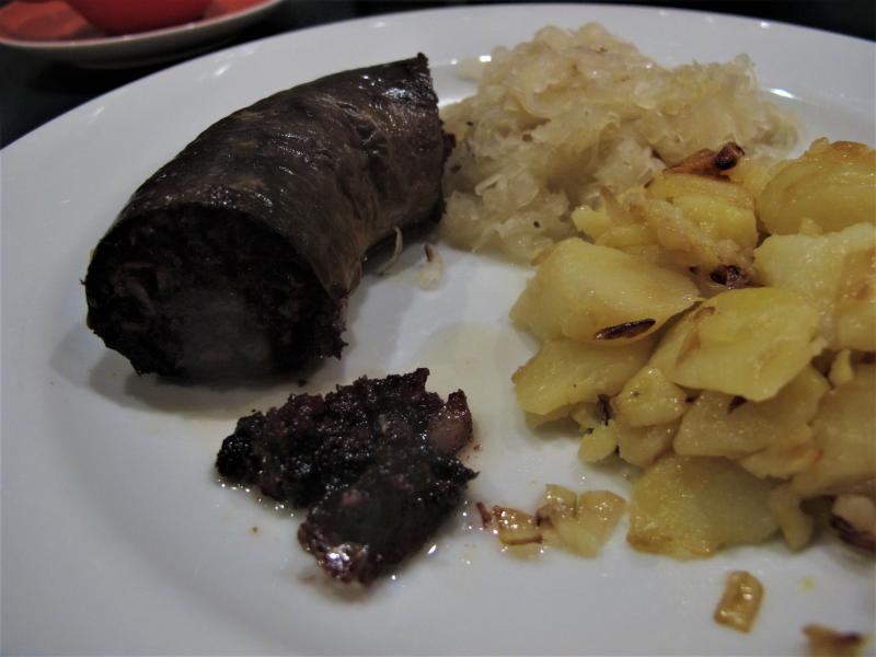 heute gab es zum ersten mal in diesem herbst/winter blutwurst vom bauernmarkt, erdäpfelschmarrn und sauerkraut. es war unglaublich gut, das bild zeigt den ersten durchgang 8)