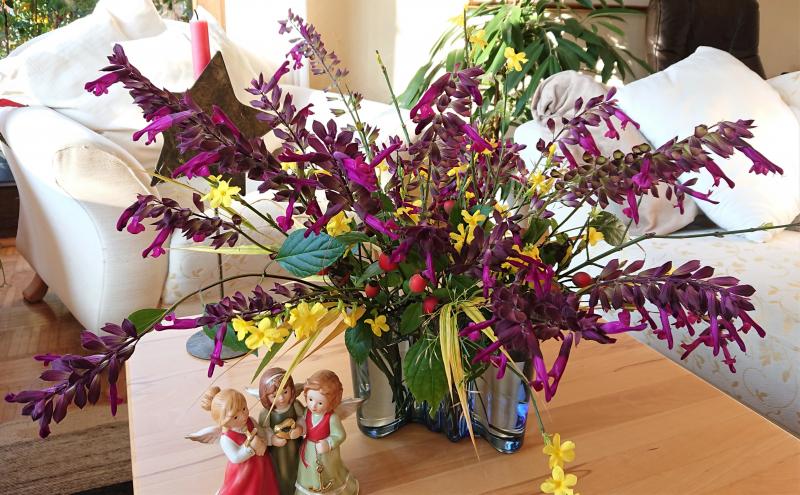 In diesem Jahr ist wegen des langen Herbstes einiges sehr spät (die letzten blühenden Salbei-Triebe) und trifft mit den Vorzeichen des Winters zusammen (Winter-Jasmin), so dass der Strauß zum ersten Advent eine etwas ungewöhnliche unzeitgemäße Kombination bildet. Gefällt aber trotzdem.