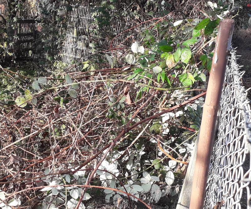 Direkt am Zaun ist zwar nichts, aber da sollte auch frei bleiben, dass man langlaufen und an dem Gebüsch notfalls was wegschneiden kann. Oder um die Brombeeranken, die sich teils schon durch durch ein paar Apfelbäume hochhangeln, einzufangen. Auch wenn es der Nachbar machen sollte, er kommt von seiner Seite eh nicht mehr dran.