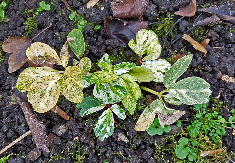 Ich werde die Blätter der Lenzrosen in diesem Jahr alsbald zurückschneiden, weil sie den Austriebe vieler empfindlicherer Frühblüher verdecken. Der Platz ist durch Gehölze leicht verschattet und damit vor Wintersonne geschützt. Die Blätter von Helleborus niger bleiben dran.