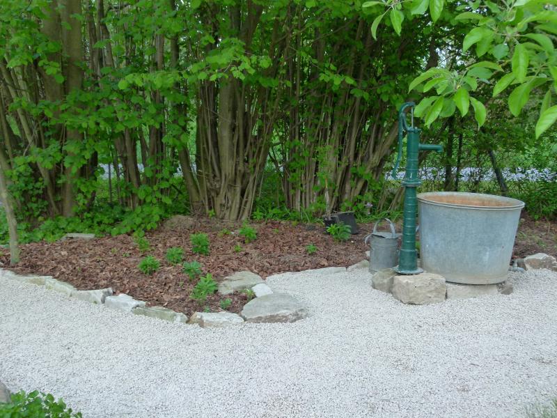 September 2018: an der Pumpe entsteht ein kleiner Platz, unter dem Apfelbaum wurde inzwischen noch mehr Rasen umgegraben:
