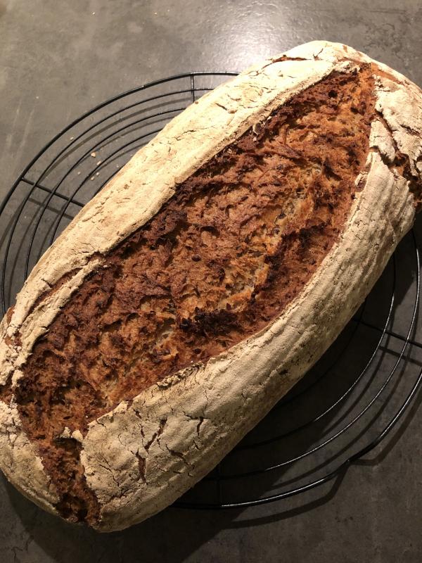 Gerade aus dem Ofen gezogen: ein Brot nach Lutz Geißler (etwas abgewandelt auf unsere Bedürfnisse).