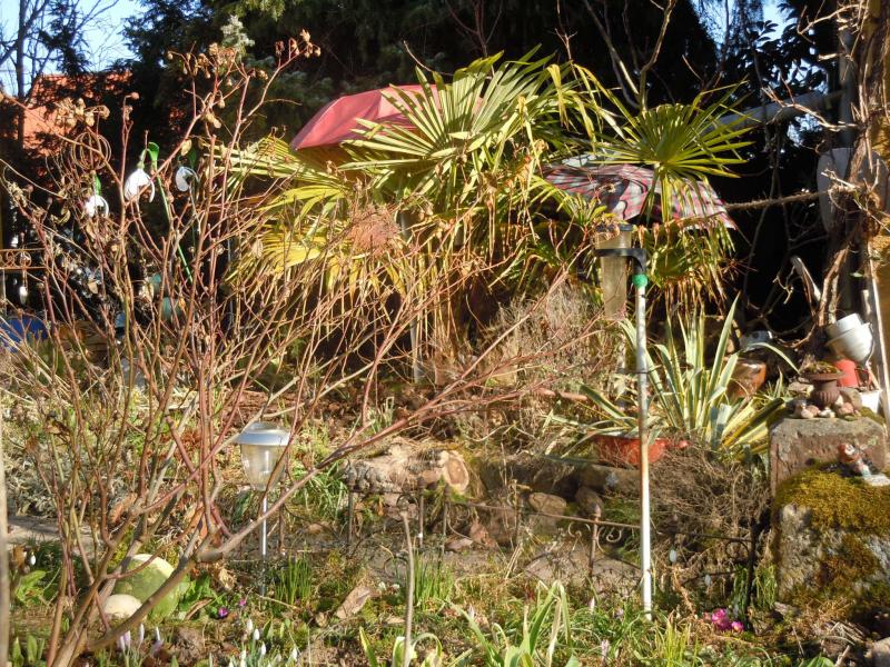 Mal sehen, was der Frost so angerichtet hat. Bis jetzt sehen meine Trachycarpus ja noch ganz gut aus. Die Rose "Yvonne Rabier" davor sieht verdächtig braungefroren aus :-\