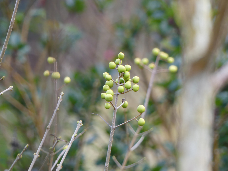 Hier ist die leider (noch!?) sehr seltene Berberis dictiophylla ein Star in den Wintermonaten. Jetzt ist das rote Laub allerdings fast ganz abgefallen und die weiß bereiften Triebe leuchten alleine durch den Winter. Dafür sind bei der Sarcococca Blüten und Früchte zeitgleich zu sehen.