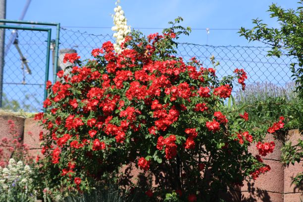 In meinem Reihenhausgarten habe ich nicht sehr viel Platz. Ich habe dennoch eine Rose auf meinem Hang so als Abschluss zum Nachbarn gepflanzt. Der Name ist "Rote Max Graf" Sie blüht leider nur einmal. Im Katalog war sie als Bodendecker deklariert. Ich habe sie aufgebunden. Die Triebe werden über 2m lang