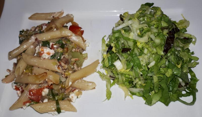Penne mit Porree, Pak choi, Räuchertofu, Tomaten und Schafskäse