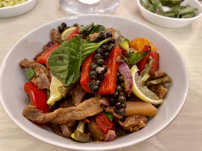 vorgebratener und dann marinierter bio-schweinenacken mit gemüse, grünem thai-curry und sojasauce, mal ohne kokosmilch