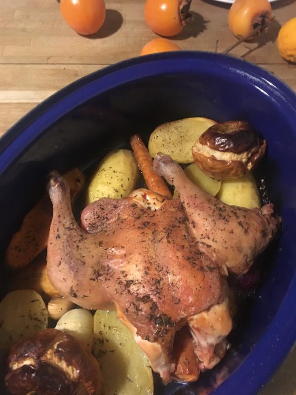 Ich trenne vom Hendl manchmal den Rücken und Flügerl ab und mache zusammen mit den Innereien eine Suppe. Brust und die anhängenden Keulen kommen auf ein Gemüsebett ins Backrohr. Reicht uns zu dritt. Sonst bleibt so viel über und aufgewärmtes Geflügel mag ich nicht so.