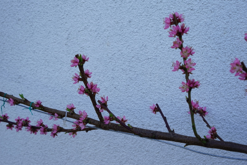 Sehr schön dein Pfirsichspalier. Es wäre toll, wenn du uns über dessen weitere Entwicklung auf dem Laufenden halten würdest. Pfirsich ist aus meiner Sicht leicht zu schneiden (man kann kaum zuviel schneiden). Aber die Spaliererziehung des Pfirsich halte ich -jedenfalls bei den strengen Formen- für deutlich anspruchsvoller als bei den meisten anderen Obstarten. Das Problem ist die wirklich hohe Vergreisungsgefahr im älteren Holz beim Pfirsich. Dein Spalier sieht super aus, keine Spur von Vergreisung, es ist aber noch relativ jung. Ich bin gespannt, ob du es schaffst, bei fortschreitendem Alter des Spaliers überall Fruchtholz zu halten. Bei der zweiarmigen Erziehung könnte das sogar klappen, weil der Baum gezwungen ist, die gesamte Wuchsenergie auf seine 2 Leitäste zu verteilen. Ich glaube, sobald man eine weitere Astetage einziehen wollen würde, wäre die Fruchtholzerneuerung in der unteren Etage sehr problematisch. Ein weiteres Problem könnte die fehlende Langlebigkeit sein. Es passiert nicht immer aber durchaus häufig, dass beim Pfirsich plötzlich eine ganze Astpartie abgängig wird. Das ist bei wenig formalen Erziehungen kein Problem, da der abgängige Ast häufig aus anderen Bereichen ersetzbar ist. Beim strengen Spalier wäre das aber ein schwerwiegender Verlust. Aus diesen Gründen wird für die Spaliererziehung beim Pfirsich häufig der Fächer empfohlen, eine deutlich weniger strenge Spalierform.