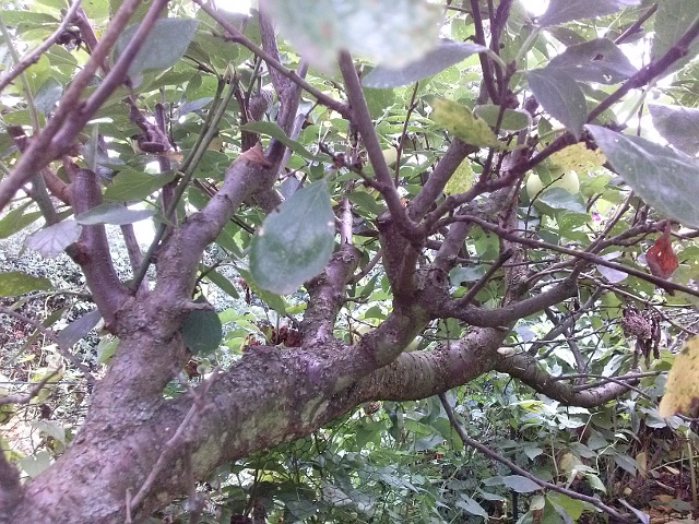 Im Bild Mirabelle, links zum Glück mal ein junger Trieb aus dem Altholz.