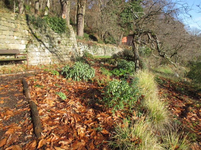 Das Waldbeet bei der alten Quitte mit Helleborus argutifolius, Acanthus mollis und Sesleria autumnalis.
