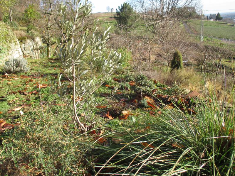 Detail mit Sarcopoterium spinosum, Olive und Stipa gigantea.