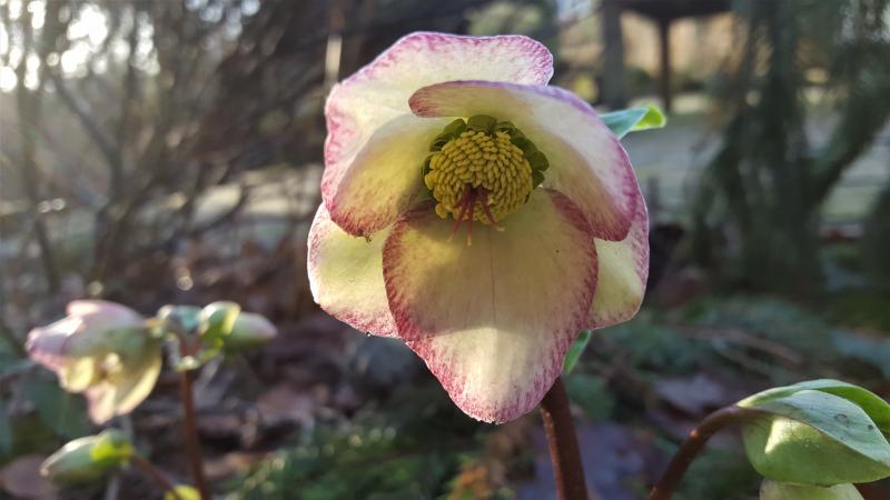Sonne, kein Schnee, kein Frost, Winter scheinbar nur in Resteuropa, Helleborus x glandorferi Picotee
