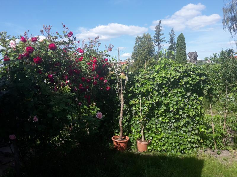 Nur im Frühjahr ist kurz der Sichtschutz weg, da die Rebe und Clematis sehr konsequent geschnitten werden 8)