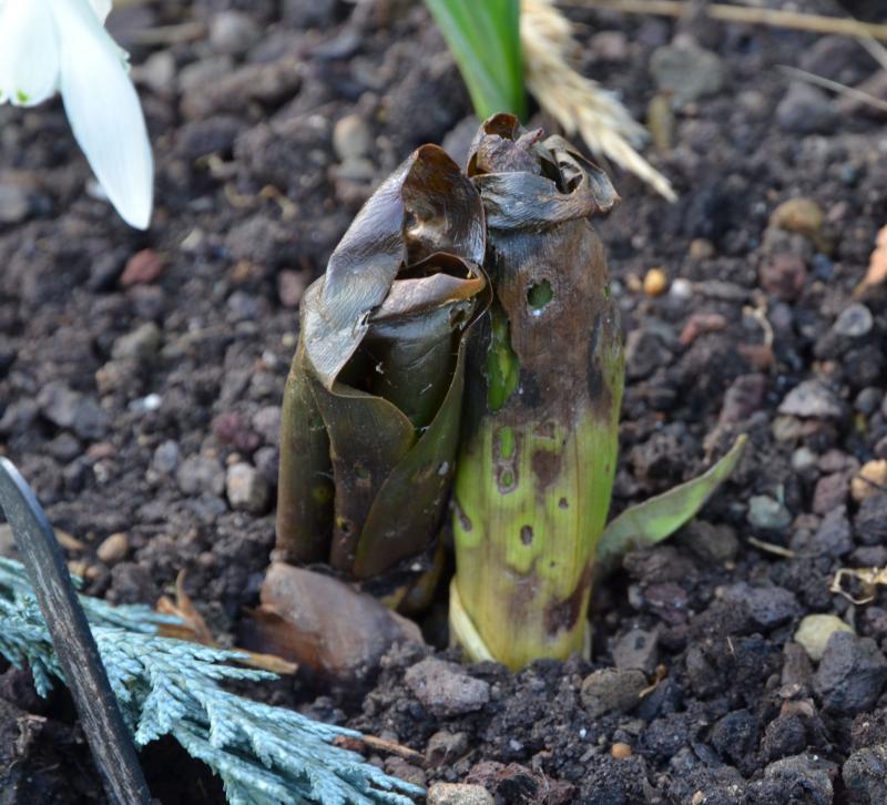 Colchicum spc. Atrorubens (im Herbst gepflanzt) war schon gar zu weit draußen und hat ordentlich eins auf die Mütze bekommen. Vor allem der linke Trieb fühlt sich sehr weich an.