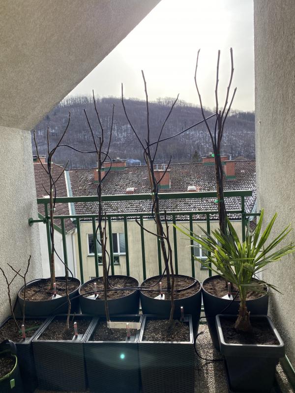 klein: Figo Moro, Sultane, Negronne, Pfälzer Fruchtfeige (BT-Typ), I-258 (noch indoor aktiv wachsend).