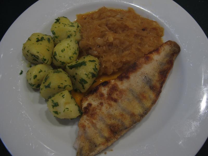 Hier gab es gebratene Zanderfilets mit Paprikazwiebelsauerkraut (mit geriebenem Edäpfl gebunden) und Petersilerdäpfl. Sehr gute, relativ neue Kombination :)