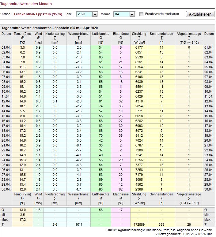 2020 war das Frühjahr recht kühl, gerade wegen der Nachttemperaturen. Werte anbei im Foto.