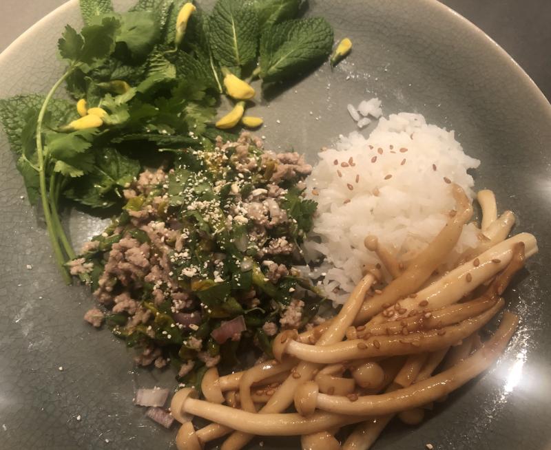 Heute gab es ein Larb mit Dok Sano nach diesem Rezept: Larb Dok Sano Allerdings statt einem Esslöffel Chili nur ein gehäufter Teelöffel. Dazu gab es Duftreis und Enokipilze in Knoblauch, Ingwer und Miso geschwenkt. :)
