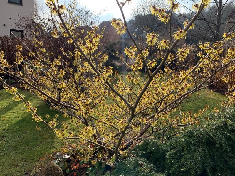 Eine Unbekannte, die jedes Jahr nach Weihnachten mit der Blüte beginnt. Inzwischen macht sie sich ganz schön breit. Leider ist der Habitus von Zaubernüssen schwer zu fotografieren.