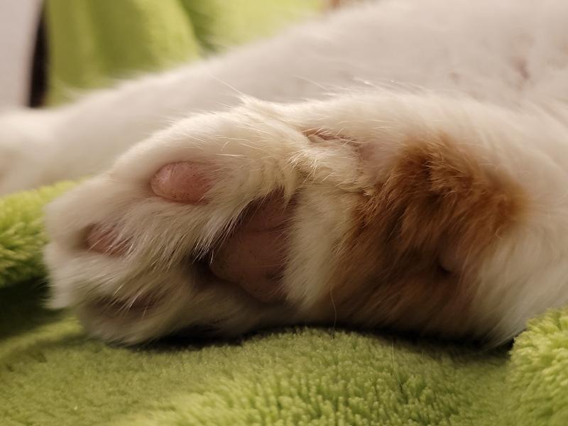 Mäxchen hier, ein Schwarz-weiß-Kater, hat rosafarbene Pfotenballen - und auch mindestens einen dunklen Fleck dabei, wie ich gerade festgestellt habe.
