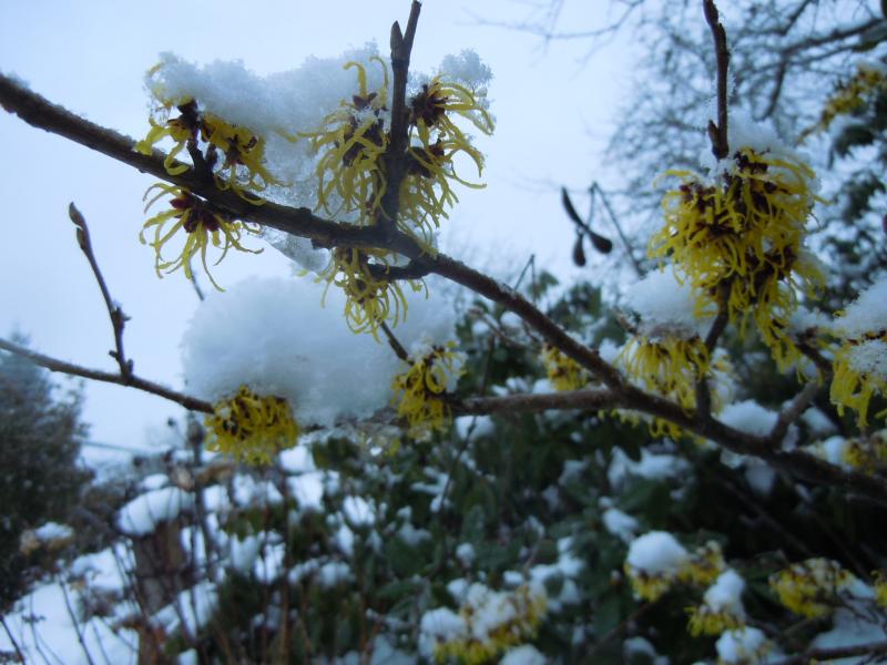 Eine Unbekannte, die jedes Jahr nach Weihnachten mit der Blüte beginnt. Inzwischen macht sie sich ganz schön breit. Leider ist der Habitus von Zaubernüssen schwer zu fotografieren.