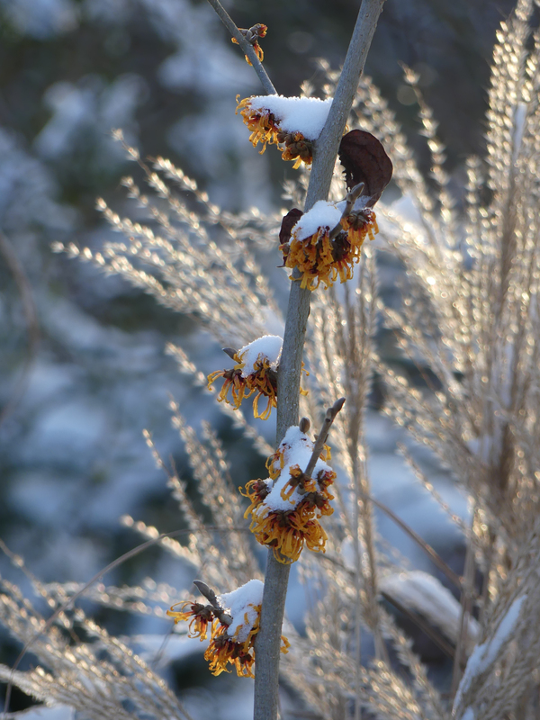 Leider hat die Zaubernuss dieses Jahr nur zehn Blütenknospenbüschel, es wäre so schön, sie da hinten in strahlendem Gelb leuchten zu sehen. Aber in der Detailaufnahme entschädigt der Anblick mit Schneehäubchen ein wenig. Irgendwann werde ich wohl den großen, niedrig hängenden Ast der Tanne entfernen müssen, damit er bei Sturm nicht genau in die Hamamelis kracht...