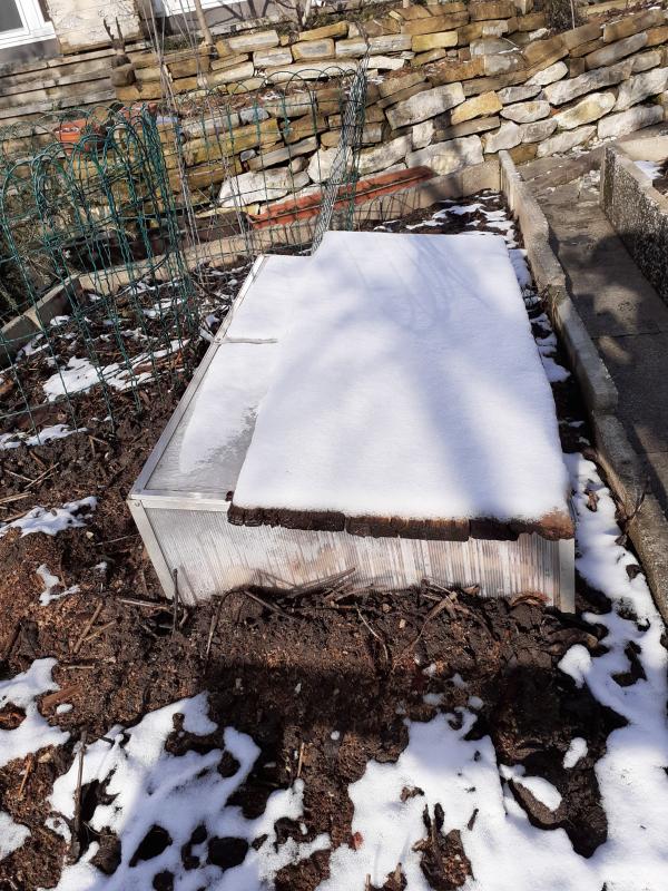 Auf jeden Fall hab ich heute die Bewurzelung der restlichen gekühlten Stecklinge gestartet. Die lagerten aus Bewurzelungsplatzgründen bisher im Naturkühlschrank. Halb eingelassenes Frühbeet mit Laubfüllung.