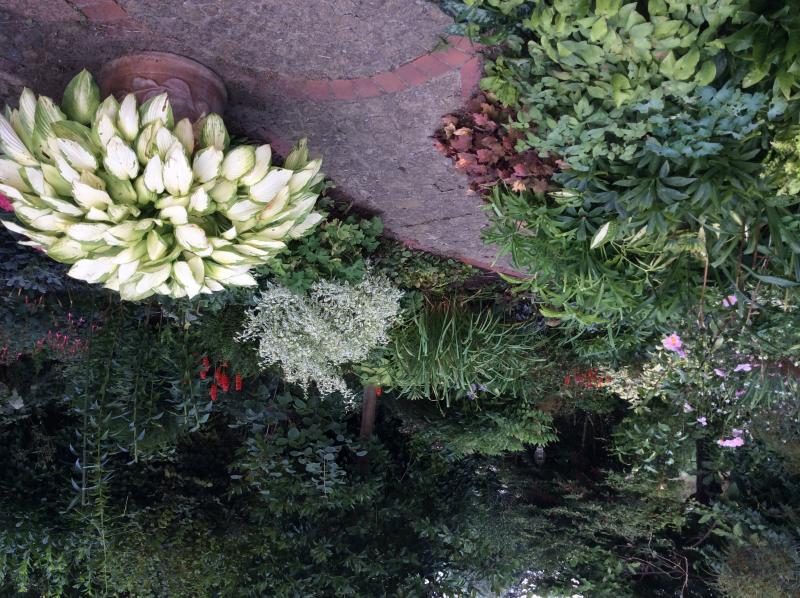 Buchenhecke im Hintergrund des Schattengartens, noch grün aber jetzt auch braun.
