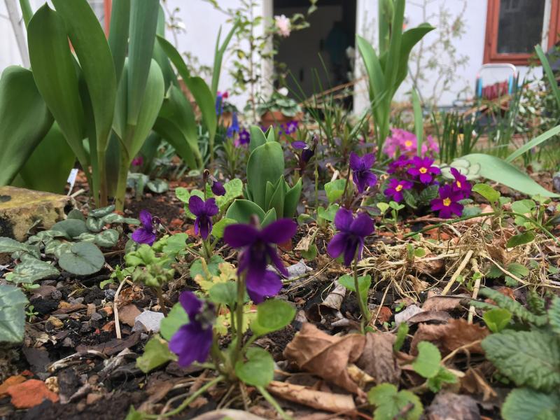 Veilchen und Primeln (und ein Erdbeerblatt)