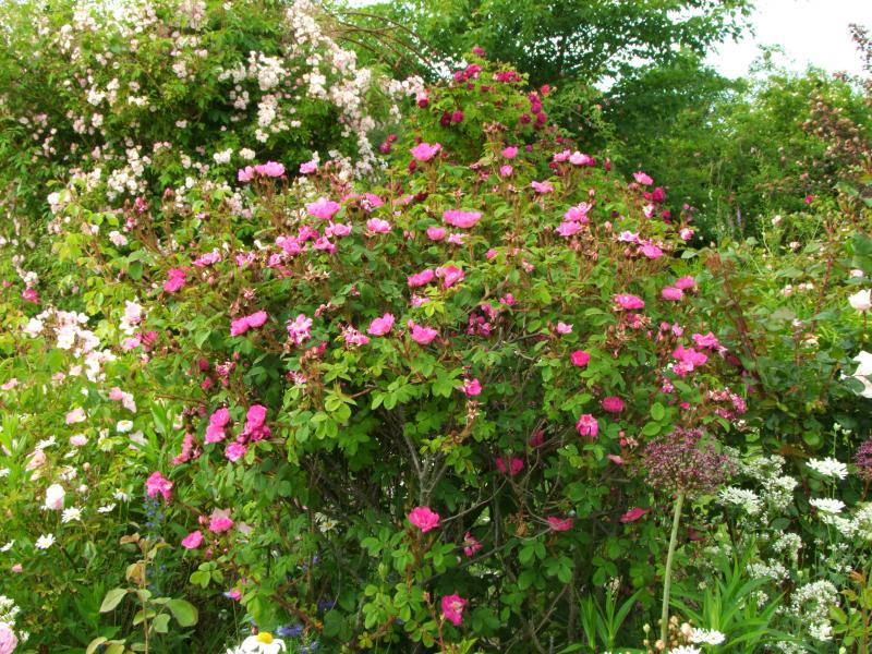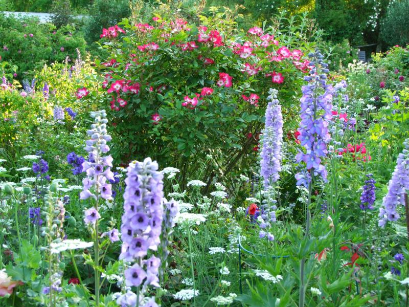 Die Pflanzung unter dem Zierapfel hat viel dunkelrot durch Taglilien und Kerzenknöterich , dazu viel Weiß durch Herbstanemone und Schönaster. Blau durch Rozanne, Astern und Baptisia. Alles erst in diesem Frühjahr gepflanzt und schon sehr üppig. Bin mir gar nicht sicher, ob eine Rose dort in der Lücke überhaupt dazu passt. Ich hätte eben nur ganz gerne eine...