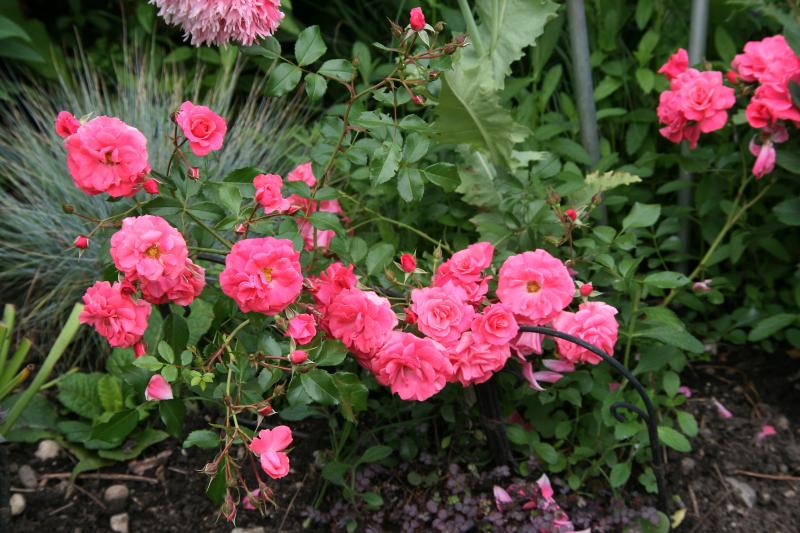 Die Rose sollte auf jeden Fall mit der silbernen Bank harmonieren, aber auch mit der Staudenpflanzung weiter links. Das ist gerade der Spagat... Rosa wäre schön, oder auch Blush oder Weiß.