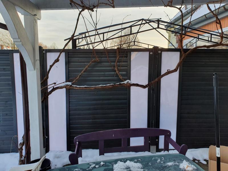 Wenn es also drum geht, neben die Terrasse was anderes zu pflanzen, würde ich den Wein eher von der dzt. Befestigung nehmen und nach links umleiten. Vielleicht läßt sich alles problemlos drehen oder sonst mit Rückschnitt, dazu im Anschluß von der Terrasse links Kletterhilfen bauen.