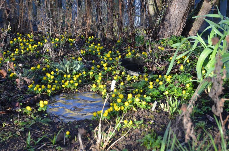 Auf den ersten Blick hat sich im Vergleich zum Foto von Anfang Januar fast nichts im Garten getan; aber eigentlich ist es kein Wunder, war das vor vier Wochen doch so ziemlich der einzige Tag mit Sonnenschein, ansonsten war's ständig kalt, grau und regnerisch. Aber beim genaueren Blick in die Beete merkt man doch deutlich, dass mittlerweile überall die Frühlingsblüher aus dem Boden spitzen, und die ersten haben mittlerweile ihre Blüten geöffnet.
