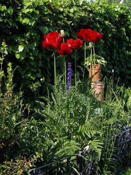 klickHier links ist der 'Beauty of Livermere', die Farbe ist nicht exakt getroffen und überbelichtet. Aber die aufrechte Wuchsform scheint mir doch recht eine Eigenschaft dieses Mohns zu sein!