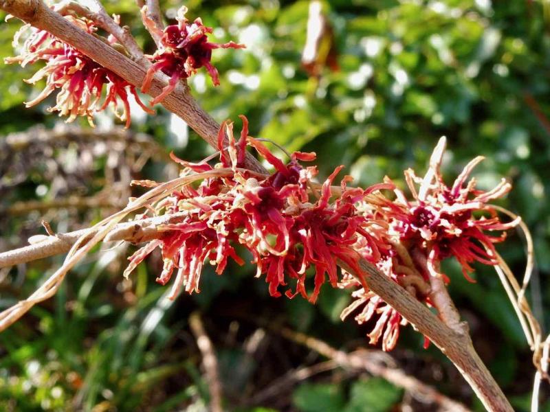 ‚Jelena‘ bildet ein Pärchen mit ‚Barmstedt Gold‘. Leider ist bei der letzten Zaubernuss ein großer Ast abgebrochen, so dass wir sie zurückgeschnitten haben. Drei neue Äste sind gewachsen und füllen das entstandene „Loch“ wieder.