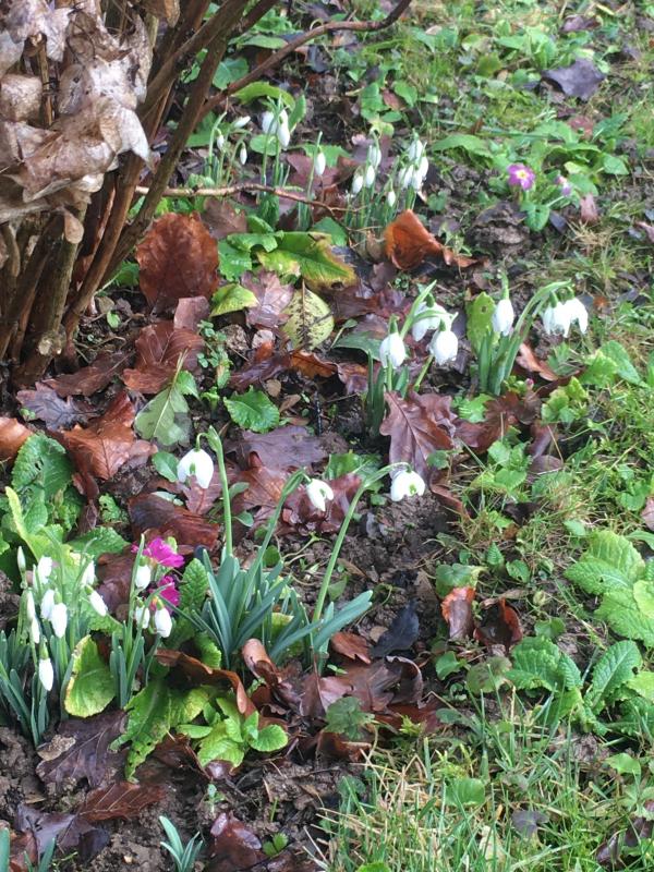 Mein Beet am Weg ums Haus herum sah im Winter etwas kahl aus, weil dort die Funkien einige Lücken hinterlassen haben, aber nun spitzen überall die im Vorgarten im Zuge der Rodung meiner ausufernden Kirschlorbeerbüsche evakuierten Schneeglöckchen heraus. Die blaue Primel blüht und blüht schon seit Monaten, und die Knospen der Lenzrose erheben sich nun Stück für Stück über den Erdboden.