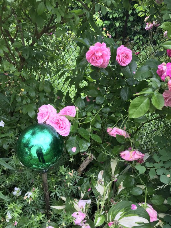 Das ist eine kleine Austinrose, die Home & Garden sie ist von Kordes. Rechts daneben die pinkfarbene ist auch wieder ein Austinrose, die John Clare. Die weiße, da fällt mir momentan der Name nicht ein. Habe ja eine Rosenliste mal gemacht, habe gerade nachgeschaut, das ist die Kosmos vom Kordes.
