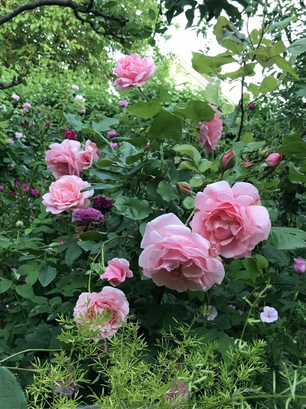 Eine schöne, gesunde Moosrose, von der wir hier noch kein Foto hatten, ist Henri Martin. Steht in einer Hecke zwischen Duchesse de Montebello und Trier.
