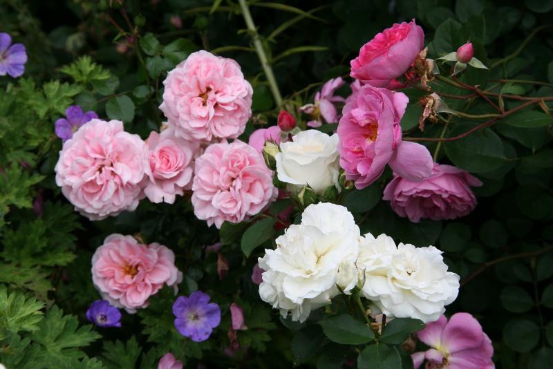 Das ist eine kleine Austinrose, die Home & Garden sie ist von Kordes. Rechts daneben die pinkfarbene ist auch wieder ein Austinrose, die John Clare. Die weiße, da fällt mir momentan der Name nicht ein. Habe ja eine Rosenliste mal gemacht, habe gerade nachgeschaut, das ist die Kosmos vom Kordes.