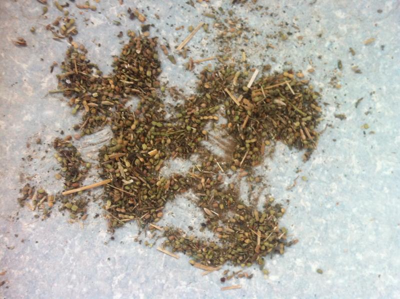 Wenn Du das grünliche meinst, was in der Bildmitte manchmal wie kleine Gliederketten wirkt, könnte es Serradella sein. Waren dann vermutlich nicht reif und sind wohl auch nicht keimfähig. (Die Hülsen vom wilden Vogelfuß wirken so ähnlich, sind aber deutlich kleiner und noch stärker gebogen.)