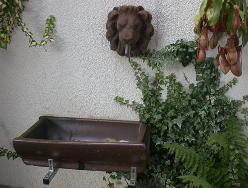zum Zug. Wollte das ja eigentlich auch in diese Richtung formulieren, dachte aber das wäre zu dick ???aufgetragen.Wigbert:Toller Marterpfahl, sieht eher aus, wie bereit um Gartenunverrückte zu fesseln.Obwohl ich rumschaute, so ganz Irrsinniges fand ich (noch) nichts, das muss ändern. Ideen wären schon da, aber an der Ausführung mangelts noch. Hier noch eine Idee, die sich noch auswachsen muss. Der Löwenkopf gibt Wasser in den Schweinetrog, darunter ein kleines Weiherlein.