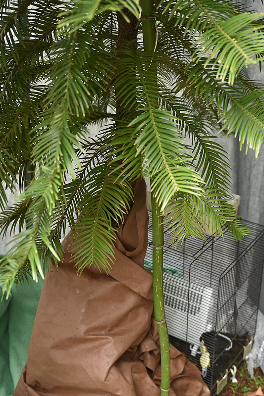 Pinus montezumae (Geschenk von HN) bekommt etwas Gewächshaus-Abwärme und bei Bedarf noch ein Mäntelchen um. Das wird knapp, aber Kiefern sind nix für drinnen oder Gewächshaus-Schimmel. Es wäre zu schön, wenn es ein paar Jahre gutgehen würde. Eine wunderschöne Kiefernart.