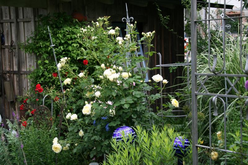 Die weiße Kletterrose hinten ist eine Bodendeckerrose die Meidiland Alba, nur damit du siehst, von was ich rede. Sie ist schon längst auf dem Dach und ich schneide sie jedes Jahr soweit runter, das sie nicht auf dem Dach aufliegt.