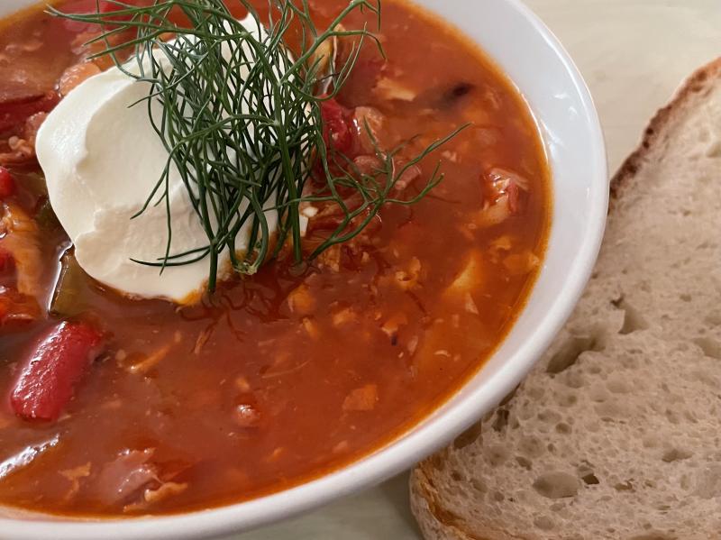 Wir hatten noch Gulaschsuppe eingefroren. Weil nicht mehr viel Inhalt drin war kamen noch Kabanossischeiben rein. Dazu wieder das leckere Topfbrot