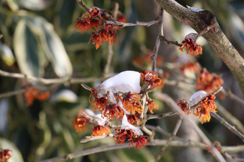 Ganz unwirklich dagegen momentan die eine einzige hier lebende Zaubernuss. Neben der Vorigen in meiner Wahrnehmung in den letzten Jahren etwas ins Hintertreffen geraten, legt sie jetzt aber doch einen wirklich großartigen Auftritt hin! Nach Duft und Farbe ausgesucht, `Pallida´ stand auf dem Etikett, dann wirds wohl so sein.