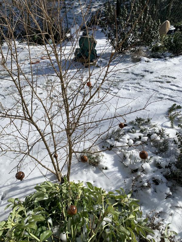 Die neu gepflanzte Campaniere sollte auch keine Probleme haben. Sie ist mit zwei Vliesschichten gut verpackt und hat noch einen Gartensack oben drauf gekriegt. Blick durch den Punica granatum 'Provence' (da hängen noch die ganz kleinen nicht mehr geernteten Früchte drauf). Rechts hinten ist Dottato zu sehen (auch verpackt).