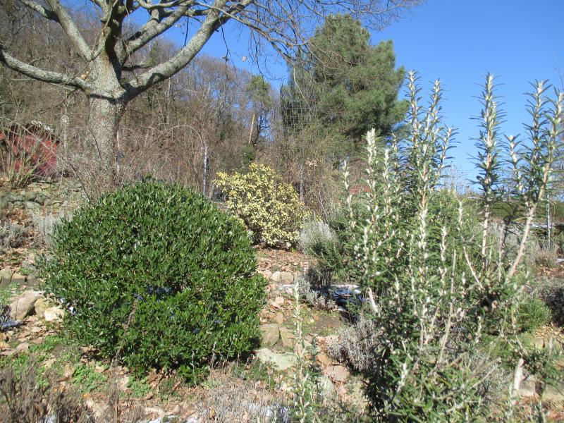 und Rosmarin mit Quercus ilex und Phlomis chrysophylla vor der großen Eiche.