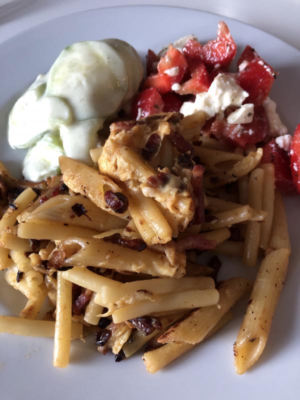 Achja, am Tag davor gab es nämlich Restenudeln mit Schinkenspeck, Zwiebeln und Ei und dazu besagte Salate.