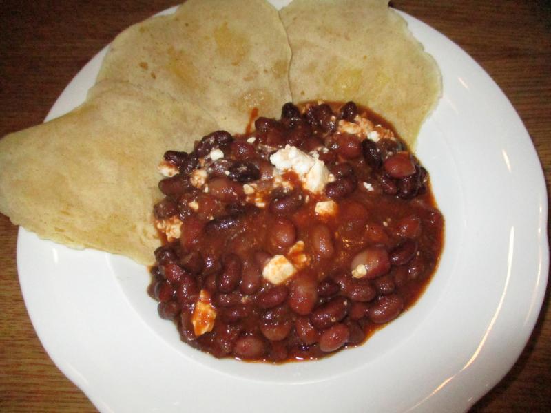 Heute kochte der Sohn aus seinem Lieblingskochbuch "Roter Drache in Aspik". Es gab die Schnelle Magenvoll-Pfanne (Maisfladen mit Bohnen - in diesem Fall schwarze Bohnen und Inca Pea Beans). War lecker, pikant und sättigend :).